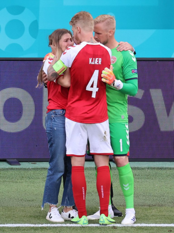 SimonKjaer y KasperSchmeichel, compañeros del ex mediocampista de Tottenham, abrazaron a Sabrina Kvist Jensen, la esposa de Eriksen, quien ingresó al césped llorando desconsolada y también desesperada. Inmediatamente después, Finlandia se marchó a los vestuarios y los hinchas daneses aplaudieron la decisión.
