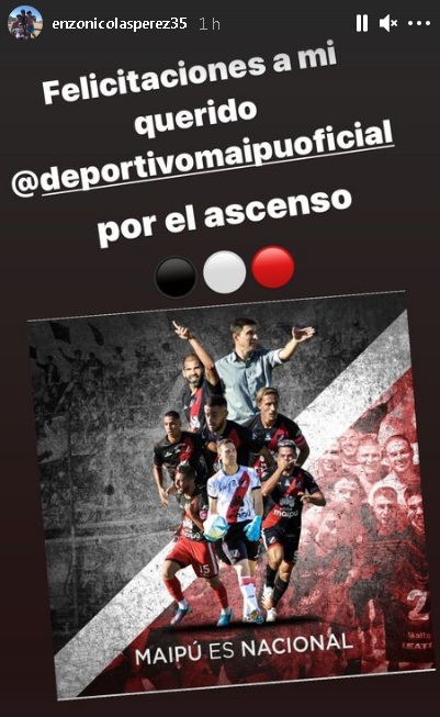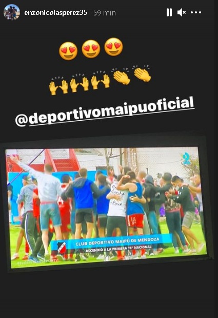 Pérez adjuntó dos capturas en sus Stories para celebrar el ascenso. Hace algunas semanas el futbolista visitó Mendoza y estuvo en La Fortaleza presenciando el duelo en el que Maipú le ganó a Camioneros 1 a 0.