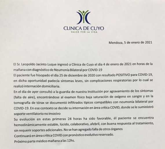 El cuadro es de neumonía bilateral derivada de la Covid - 19. Luque había comenzado los síntomas antes de Navidad y obtuvo el hisopado positivo antes de Año Nuevo.