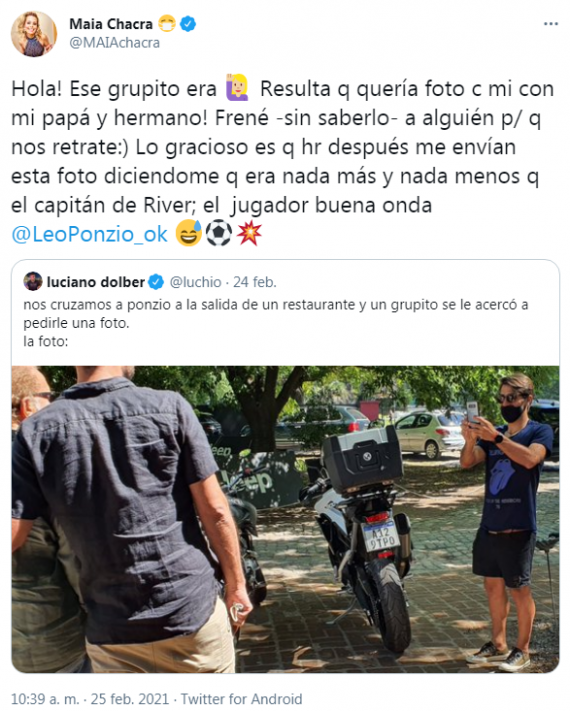 "Resulta que quería una foto con mi papá y mi hermano y frené a alguien para que nos retrate", explico. "Lo gracioso es que horas después me envían esta foto diciéndome que era nada más y nada menos que el capitán de River, el jugador buena onda Leo Ponzio", concluyó.