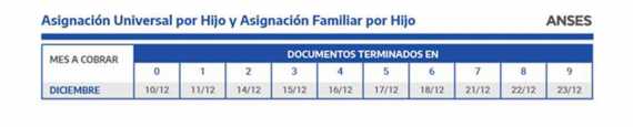 En el caso de la AUH, los pagos comenzarán a partir del 10 de diciembre para los beneficiarios con Documento Nacional de Identidad (DNI) finalizado en 0 y culminará el miércoles 20 de noviembre. Desde del jueves 17 cobrará el resto de los beneficiarios.