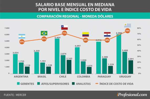 El estudio también destaca la capacidad de compra de dichos salarios tomando como referencia el índice de costo de vida de las ciudades, elaborado por Mercer para expatriados. En este caso, la mejor relación entre costo de vida y salario la tienen Uruguay y Chile.