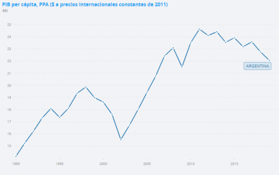 Hay que recordar que el PBI per cápita de la Argentina, según las cifras del Banco Mundial, alcanzó su nivel más alto en 2011 y fue de USD 24.647 según PPA y de USD 10.883 a precios constantes.