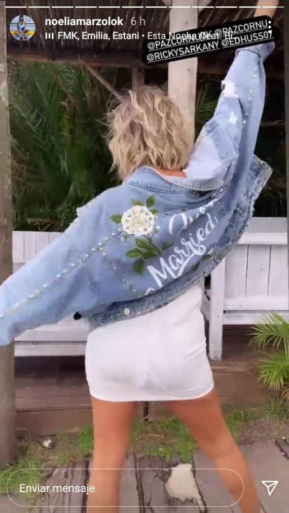 Noelia usó un vestido de la diseñadora Paz Cornú y una campera de jean con la leyenda "recién casados". Ramiro optó por camisa blanca y pantalón azul.
