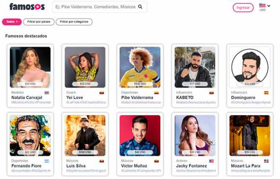 También existe desde hace mucho tiempo Famosos.com donde por 75 dólares puede saludarlos Carlos Baute, por 100 el Pibe Valderrama; Quique Arce de la Casa de Papel por 125 y por 50 la recién incorporada argentina Romina Malaespina; por 30 Osvaldo Laport o Rolando Schiavi; y Fredy Villareal por 20.