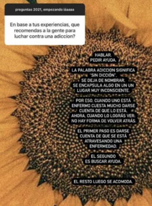 "En base a tus experiencias, ¿Qué recomendás a la gente para luchar contra una adicción?", le preguntó uno de sus seguidores en esa red social; a lo que la actriz respondió qué fue lo que le funcionó a ella para salir adelante y recuperarse de las adicciones. "Hablar, pedir ayuda", empezó la artista.