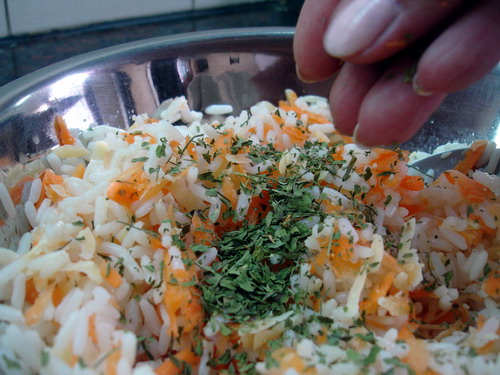 1- Colocar el arroz ya hervido en un bol y agregar el perejil y la cebolla, si no usan deshidratados la cebolla debe saltearse hasta que quede trasparente en un poquito de aceite. A eso sumarle la zanahoria rallada, la sal y la pimienta a gusto y mezclar.