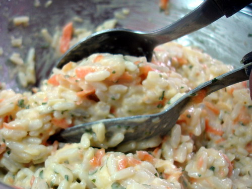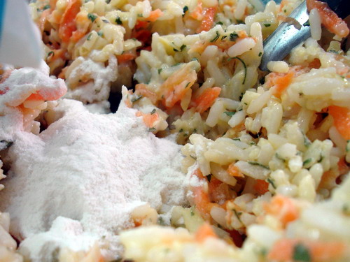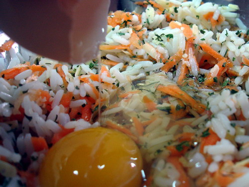 Ingredientes: arroz hervido 2 tazas (se puede usar lo que quedó de otra preparación también), 1/2 cebolla o cebolla deshidratada, 1 zanahoria grande, perejil fresco picado o deshidratado, 1 cucharada de queso de rallar (opcional), 2 o tres huevos según sea necesario, sal y pimienta, y harina leudante cantidad necesaria.