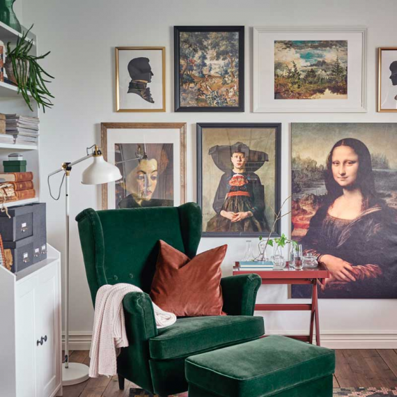 Otra solución que funciona es elegir reproducciones de cuadros conocidos y destacados. Fíjate en este rincón. Su decoración es low cost y sin embargo suma estilo y nivel por las láminas escogidas para decorar la pared. Y si lo preferís funcionan también las fotografías archiconocidas (ese marine besando a su novia; Kate Moss en blanco y negro; alguna instantánea de Marilyn Monroe)