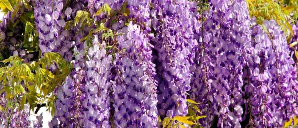- Wisteria floribunda: de origen japonés ofrece, preciosos racimos de color azul, blanco o rosas y crece enroscándose en el sentido contrario a las agujas del reloj.