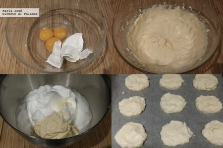 Mezclamos ambas masas con la ayuda de una espátula, realizando movimientos envolventes. Colocamos una hoja de papel de hornear sobre una bandeja de horno y sobre ella repartimos 9 montones de masa, formando círculos. Horneamos 20 minutos.