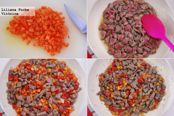 Preparación: retirar los posibles excesos de grasa de la carne de ternera. Cortar en tiras finas y después en taquitos pequeños. Picar la cebolleta y el diente de ajo. Pelar la zanahoria y picar bien en trozos de aproximadamente el mismo tamaño. Picar el pimiento de la misma manera, desechando los filamentos y las semillas.
