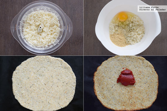 Ingredientes (para 2 personas): 170 gr de coliflor, 1 huevo; 15 gr de lino o almendra molida; hierbas provenzales a gusto; pimienta negra molida a gusto; sal a gusto; ajo granulado; queso parmesano (opcional).