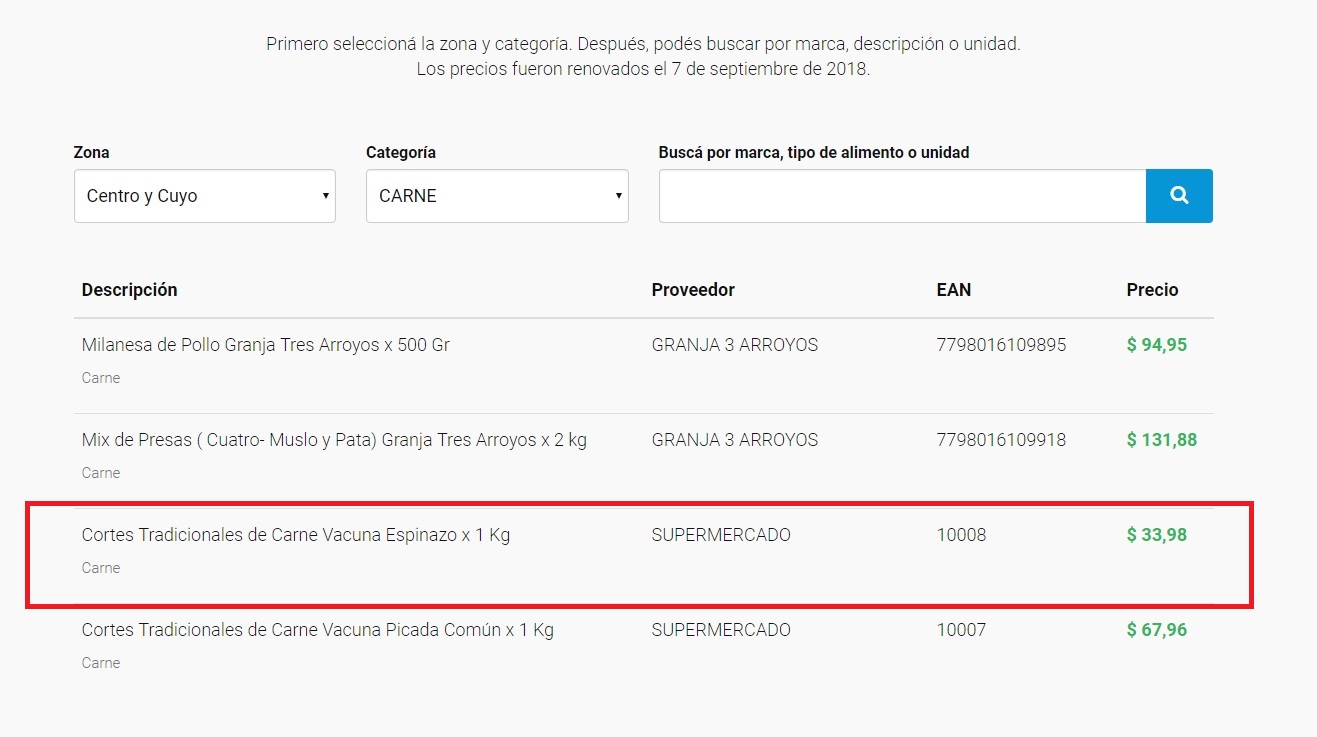 En dicho listado aparecen artículos como yerba, leche, fideos, arroz, aceite y hasta dos tipos de corte de carne: molida común, a $67,96 el kilo, y espinazo al módico precio de $33,98 el kilo.