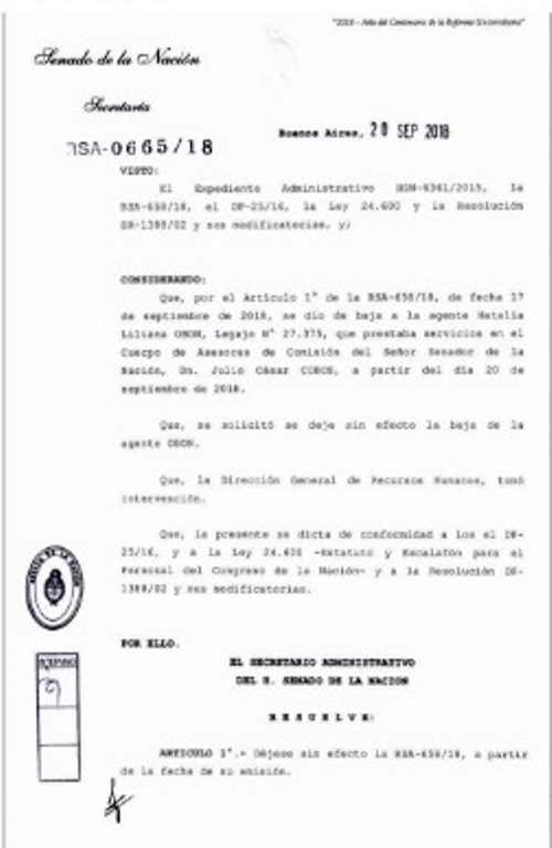 Julio Cobos remedó la situación laboral de Natalia Obon anulando su renuncia como asesora por lo que ha retornado a ese cargo en el Congreso.