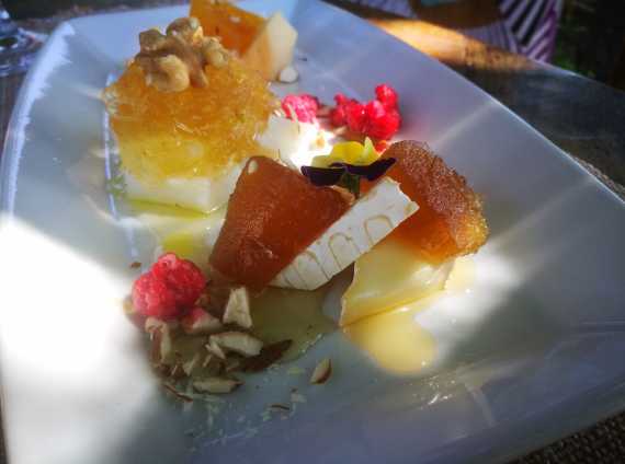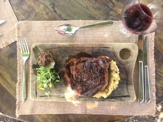 Principales: Ojo de bife con puré de calabaza y hoja de alcaucil con quinoa. Aunque al punto de la carne le faltó para mi gusto, el plato resultó muy abundante, con una mistura muy bien lograda entre lo fuerte del bife con la suavidad del acompañamiento. El otro principal fue Cerdo Apanado con puré de calabazas, que le levanto el pulgar un rato largo. Todo maridado con un Puro 2017, blend de Merlot, Malbec y Cabernet Sauvignon, un vino orgánico de cosecha manual que se vuelve rebelde y te hace zapatear la lengua para dejarte sin palabras. Probalo y no digo más.
