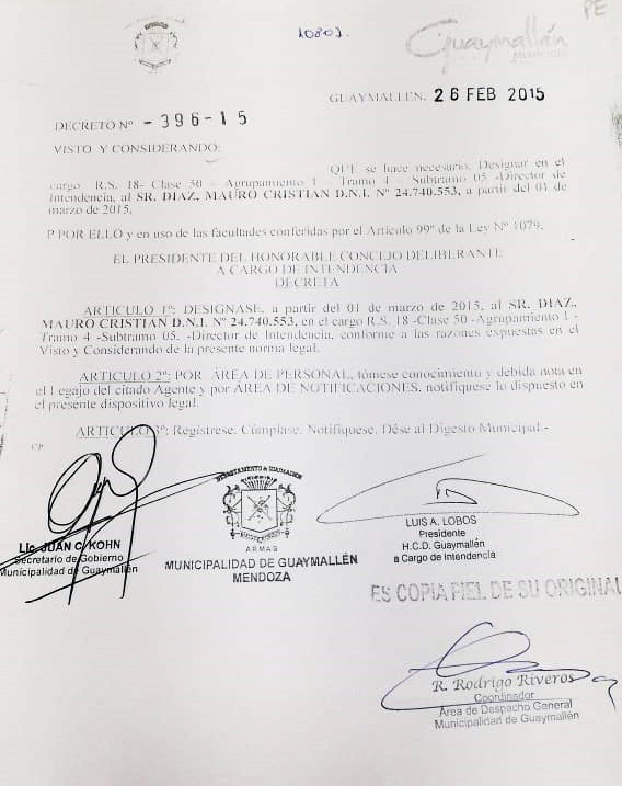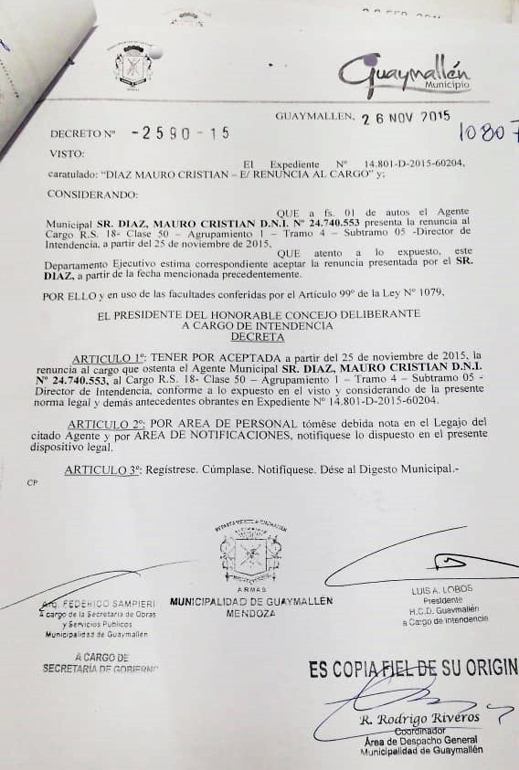 Según los decretos a los que accedió este diario, el "chamán" Mauro Díaz, de Rodeo de la Cruz, asumió en febrero de 2015 y renunció el 25 de noviembre del mismo año, que en la práctica, fue el último día de gestión de Lobos.