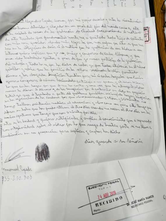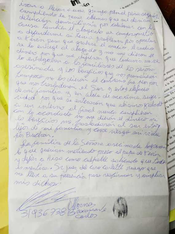 "Como sabían que yo manejaba el pabellón y sabían que ahí estaba Kevin, me ofrecieron dinero que les daban los hijos y la hermana de la mujer asesinada... y beneficios que los abogados podían conseguir" escribió Carlos Albornoz (su carta es la misiva escrita con tinta azul).