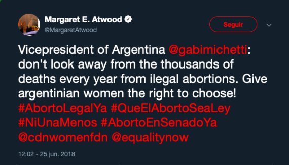 La misma Margaret Atwood interpreló a la vicepresidenta Gabriela Michetti cuando el proyecto de IVE de 2018 llegó al Senado: "Vicepresidenta de Argentina @gabimichetti", publicó en su cuenta de Twitter el 25 de junio del año pasado, "no mire para otro lado ante las miles de muertes anuales por abortos clandestinos. ¡Déle a las mujeres argentinas el derecho a elegir!".