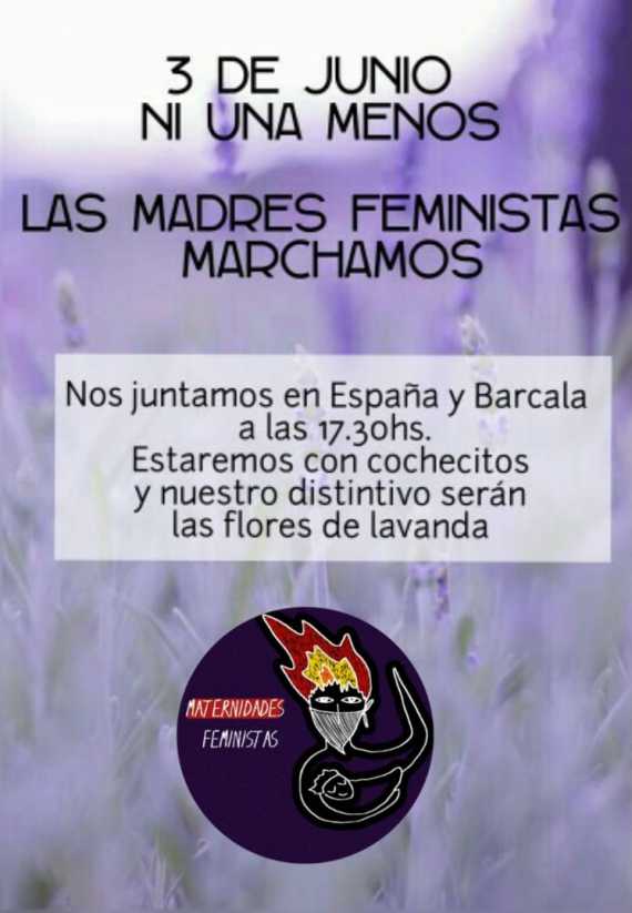 Una de las tantas agrupaciones que se suman al #NiUnaMenos será la de Maternidades Feministas. Mujeres, personas gestantes e identidades que ejercen el rol de maternaje y cuidado marcharan con sus "cachorres". Esta columna se concentrará a las 17.30hs en calle Barcala y España. Para luego acercarse al kilometro cero.