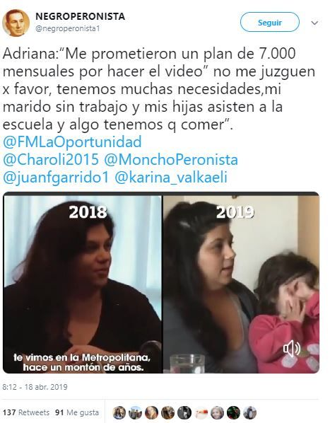 La vecina no se imaginó lo que vendría después: luego de unas horas de haber protagonizado la comunicación oficial al lado del Presidente, diversos usuarios de Facebook, Twitter y WhatsApp viralizaron una nota donde se afirmaba que Adriana había pedido un plan social de $7 mil mensuales a cambio de participar del video.
