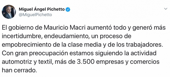 El más curioso de ellos es un tuit que publicó el 15 de marzo pasado y que luego decidió borrar. Allí hacía una crítica feroz hacia su hoy elector: "El gobierno de Macri aumentó todo y generó más incertidumbre, endeudamiento, un proceso de empobrecimiento de la clase media y de los trabajadores. Con gran preocupación estamos siguiendo la actividad automotriz y textil, más de 3.500 han cerrado", sostuvo.