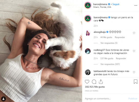 Desde Miami, publicó una serie de dulces imágenes jugando con un perrito. Además de enternecer a la mayoría, muchos usuarios posaron su mirada en la delantera de la cantante, más precisamente en sus ?timbres'