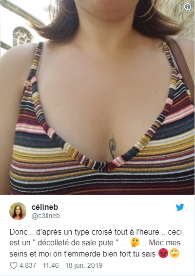 El 18 de junio, la usuaria de Célineb, publicó una foto de su escote junto a un mensaje que relataba la situación vivida: "Así que, según un tipo con el que me crucé en la calle hace un rato, este es el escote de una ?sucia puta'. Mis pechos y yo te mandamos a joder".