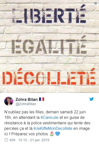 Quien también proporcionó un gran impulso a esta campaña viral fue la panelista radial Zohra Bitan. La mujer incitó a las demás a mostrar sus escotes con el eslogan "Libertad, igualdad, Escote", haciendo una pequeña modificación al emblema de la Revolución Francesa: "Libertad, igualdad, fraternidad". Además, ella añadió el hashtag #JeKiffeMonDécolleté ("Me encanta mi escote").