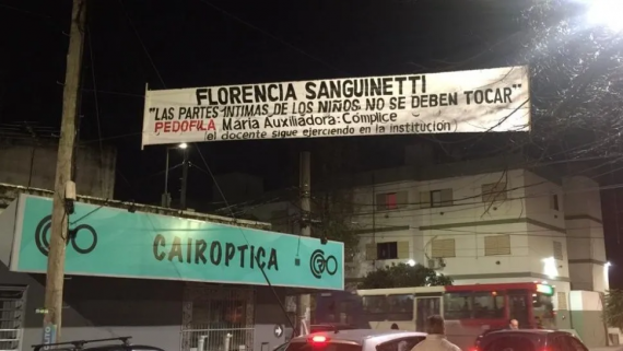 Según consta en la denuncia policial, la mujer comenzó a sospechar cuando el miércoles pasado vio un pasacalle frente al colegio que decía "Florencia Sanguinetti, las partes íntimas no se tocan, pedófila, colegio María Auxiliadora, cómplice".