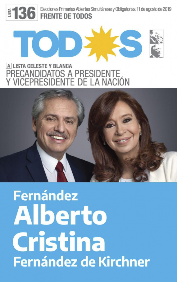 El Frente de Todos, que se presenta con la lista "celeste y blanca" y el número 136, lleva una boleta dividida en tres partes de tamaño similar, con una fotografía de ambos candidatos, muy sonrientes, en la parte central; en la que la candidata a vice aparece sutilmente adelante del postulante a Presidente.