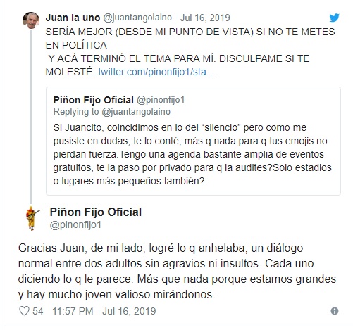 La discusión cerró con un: "Gracias Juan, de mi lado, logré lo que anhelaba, un diálogo normal entre dos adultos sin agravios ni insultos. Cada uno diciendo lo que le parece. Más que nada porque estamos grandes y hay mucho joven valioso mirándonos".