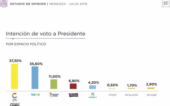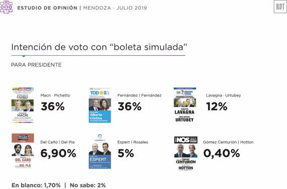 - En términos de intención de voto, el estudio registra al igual que en el promedio nacional, una fuerte polarización. Los datos de Mendoza arrojan una "paridad absoluta" entre las fórmulas presidenciales: 36% para Macri-Pichetto y 36% para Fernández-Fernández.