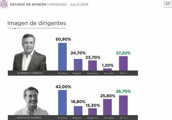 El que hace la diferencia es Cornejo. El gobernador llega al fin de su mandato con la imagen más alta que se le haya medido en el último año, de más del 50 %. Ningún gobernador de Mendoza ha llegado a su último semestre con tales niveles de aprobación. No sólo le alcanza hoy para empatar o ganarles a Cristina y Alberto Fernández en Mendoza, sino que el empuje permitiría la victoria de Rodolfo Suarez en las elecciones generales a gobernador del 29 de septiembre, por sobre la senadora cristinista Anabel Fernández Sagasti. Suárez registra 49,6 % de intención de voto, contra un 33,2 % de Anabel, la candidata del peronismo mendocino.