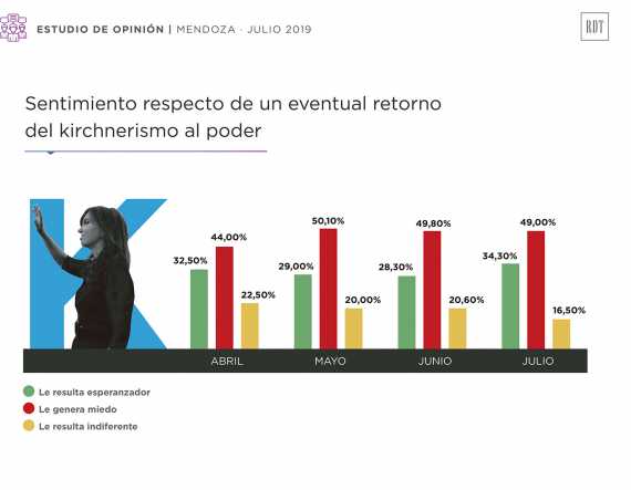 Hay más datos que hacen, de acuerdo al estudio, más probable el triunfo de Macri-Pichetto-Cornejo en Mendoza que Alberto-Cristina-Marisa Uceda: el 49 % de los consultados siente "temor" de un eventual regreso de Cristina Fernández al poder, y "La Cámpora" como entidad política le genera sentimientos negativos al 50 % del electorado mendocino.