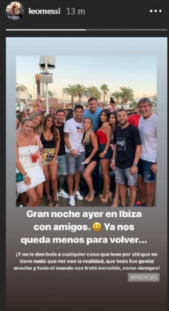 "Gran noche ayer en Ibiza con amigos. Ya nos queda menos para volver", escribió el rosarino en una story de Instagram en la que posa junto a su mujer Antonela Roccuzzo y algunos amigos como Luis Suárez, Jordi Alba y Cesc Fabregas, entre otros.