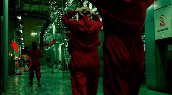 En los últimos minutos del primer episodio de la serie, los ladrones entregan a los rehenes los icónicos trajes rojos. Todos los personajes del interior de la fábrica van desde entonces uniformados. Sin embargo, a lo lejos se puede ver a un hombre, tal vez alguien despistado del equipo de la serie, caminar hacía ninguna parte.