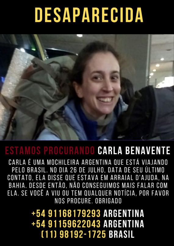 "Ya están circulando afiches oficiales que elaboró la policía que además comenzó las investigaciones en Arraial d'Ajuda -localidad cercana a Porto Seguro- que es desde donde se comunicó Carla la última vez", añadió.