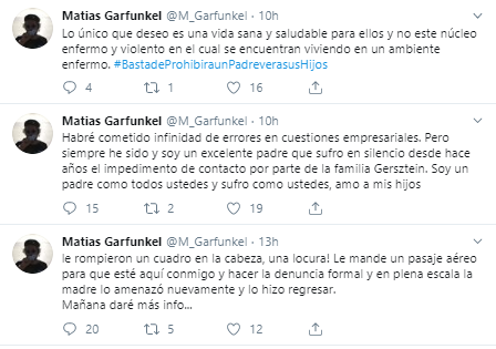"Después de tantos años sin aparecer públicamente me vi en la obligación de hacerlo ya que mi ex mujer (No Victoria Vannucci la cual es una excelente madre y llevo separado 8 meses) esto es acerca de Mariana Gersztein, Sergio Gersztein y el padre Jorge Gersztein que están ....", puso en el primero de sus cuatro tuits.