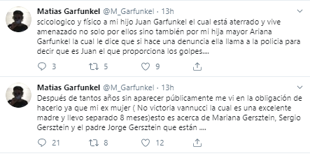 El tuit sigue así: "Psicológico y físico a mi hijo Juan Garfunkel el cual está aterrado y vive amenazado, no solo por ellos sino también por mi hija mayor Ariana Garfunkel la cual le dice que si hace una denuncia ella llama a la policia para decir que es Juan el que proporciona los golpes...."