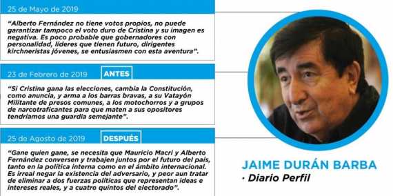 Al lado de la foto de Durán Barba y Olmedo se pueden leer tres citas textuales de él, dos anteriores a las PASO y una posterior, cuando el Frente de Todos había derrotado a Juntos por el Cambio por un amplio margen.