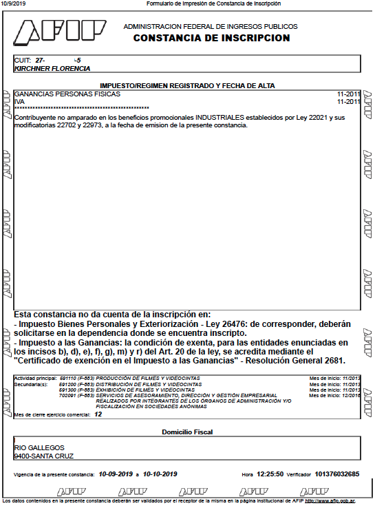 Sin embargo, según una constancia de inscripción en la AFIP, Kirchner registró entre 2013 y 2016 una actividad laboral principal y tres secundarias.