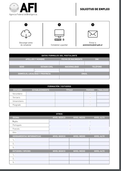 La "solicitud de empleo" para ingresar a la AFI busca obtener los datos personales, de educación y la historia laboral de los postulantes, así como también pregunta el "objetivo laboral": "¿En qué tareas considera que puede contribuir dentro de la Agencia Federal de Inteligencia?", deben responder los interesados en sumarse al mundo del espionaje.
