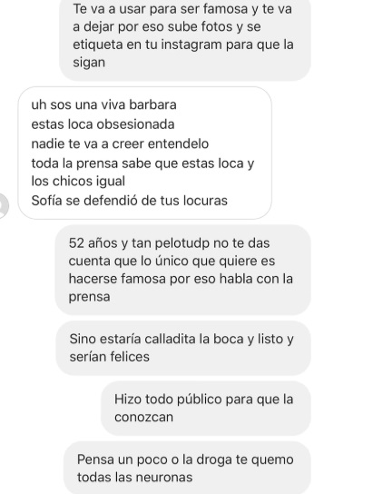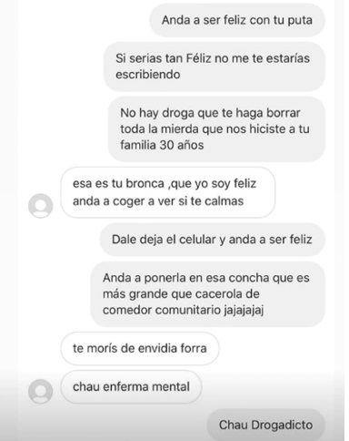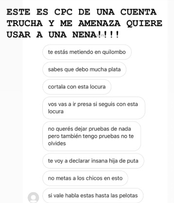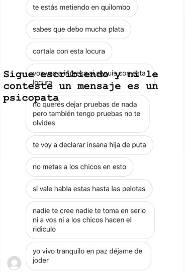 Ella muestra los diálogos como víctima, pero la verdad es que el trato entre ambos es tan agresivo y temerario que los chicos de Caniggia Libre se deben haber criado en un infierno.