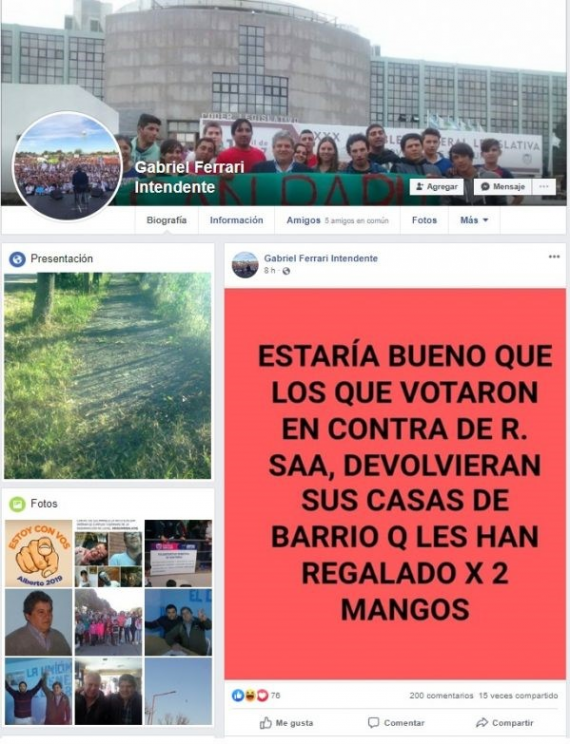 El intendente de la localidad de San Pablo, en la provincia de San Luis, Gabriel Ferrari, le pidió hoy a la gente que devuelva las viviendas que recibieron del gobierno provincial por no haber votado a la fórmula Fernández-Fernández en las elecciones presidenciales, que era apoyada por el gobernador, Alberto Rodríguez Saá.