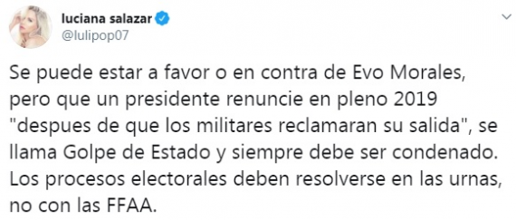 De inmediato la conferencia que llevó a cabo el dirigente generó repercusión y quien no tardó en manifestarse al respecto fue Luciana Salazar. "Se puede estar a favor o en contra de Evo Morales, pero que un presidente renuncie en pleno 2019 "despues de que los militares reclamaran su salida", se llama Golpe de Estado y siempre debe ser condenado. Los procesos electorales deben resolverse en las urnas, no con las FFAA", redactó la modelo.