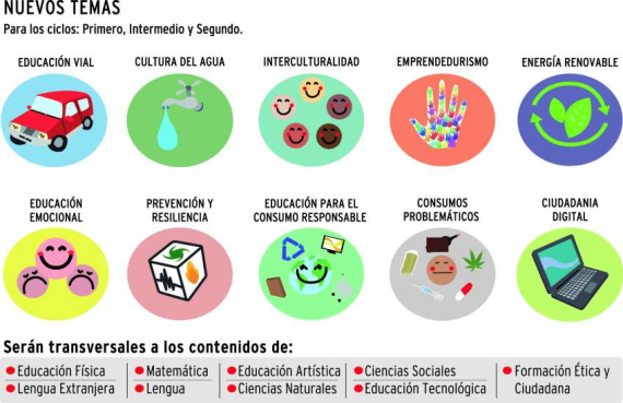 La nueva currícula estará basada en 17 pilares: Cultura del Agua, Derechos Humanos, Energías Renovables, Primeros Auxilios, Educación para el Consumo Responsable, Cuidado del Medio Ambiente, Habilidades Sociales, Educación Inclusiva, Interculturalidad Dialogante, Educación Emocional, Alimentación Saludable, Prevención de Consumos Problemáticos, Ciudadanía Digital, Educación Sexual Integral, Prevención y Resiliencia Social, Educación Vial e Iniciativa Emprendedora. Estos ejes serán transversales a Matemática y Lengua, pero también a Educación Física, Educación Artística, Ciencias Sociales y Formación Ética.