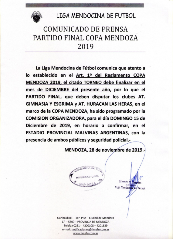 La Liga Mendocina de Fútbol confirmó que la final de la Copa Mendoza se disputará el domingo 15 de diciembre.