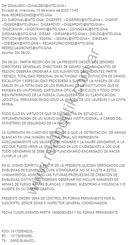 A través de lo que sería una comunicación interna emitida por la Dirección Nacional de Gendarmería, se ordenó suprimir la imagen de los sables en la totalidad de los emblemas de la institución que se exhiban en uniformes, cartelería oficial, vehículos y todo otro bien patrimonio de la fuerza.