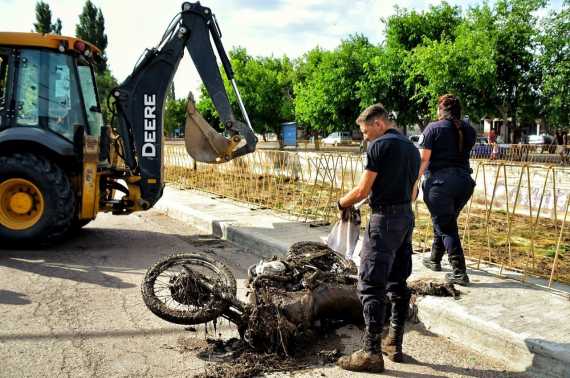 Ya en la mañana, a las 9, encontraron la moto llena de barro en calles Almirante Brown y Asistente Ubilla, dan con una moto color negra tapada con barro.